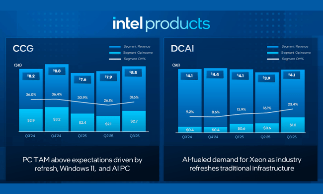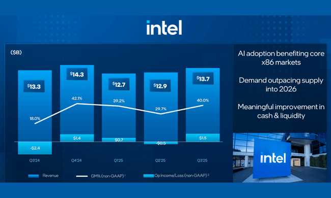 V tretjem četrtletju leta 2025 je Intel dosegel prodajo v višini približno 13,7 milijarde dolarjevkar pomeni 3-odstotno medletno rast. To je pomembno po več letih upadanja prodaje - kaže, da podjetje ni več v prostem padu. Rast izhaja predvsem iz dejstva, da se povpraševanje po procesorjih za osebne računalnike stabilizira in da se pojavljajo nove priložnosti na področju umetne inteligence, čeprav na področju podatkovnih centrov še ni opaziti bistvenega preobrata.