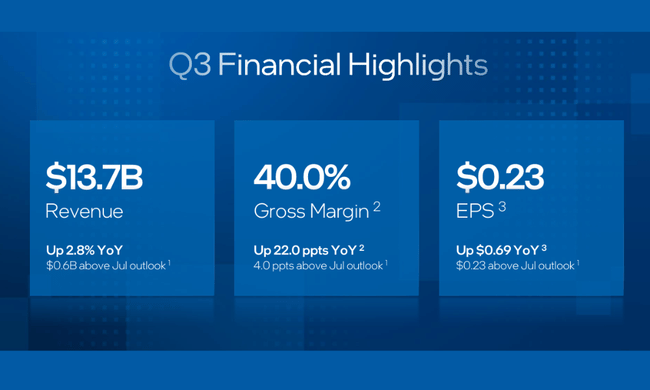 Tudi slika na ravni dobička iz poslovanja se je bistveno spremenila. Lani je Intel v tretjem četrtletju poročal izgubo iz poslovanja z maržo okoli -68 % na podlagi GAAP, letos pa je znašala pozitivna marža iz poslovanja v višini približno 5 %.. Po prilagoditvi za izbrane postavke je marža iz poslovanja brez upoštevanja GAAP povečala na 11,2 %.ponovno po skoku iz precejšnje negativne vrednosti. K temu je pripomogla močno znižanje stroškov: seštevek stroškov za raziskave in razvoj ter stroškov za prodajno/administrativno podporo se je na letni ravni zmanjšal za približno petino (GAAP) oziroma nekaj manj kot 17 % (non-GAAP).